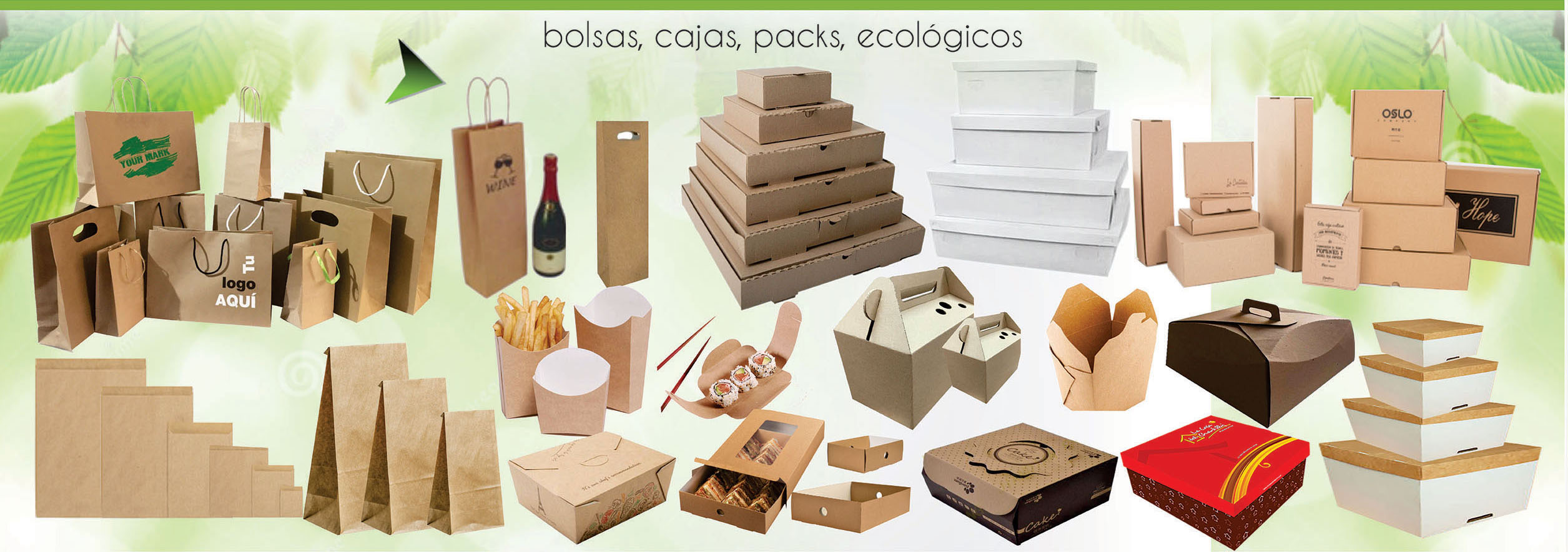 Bolsas, cajas y packs ecológicos en materiales y medidas perzonalizadas impresas en offset y en serigrafía.